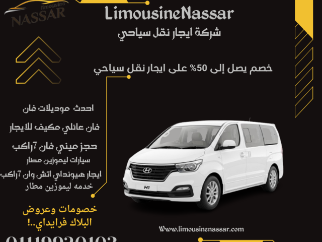 احجز الآن هيونداي H1 موديل 2025 سياحي 7 راكب من ليموزين نصار واستمتع بتجربة نقل فاخرة تناسب العائلات والشركات والرحلات السياحية. نقدم عروض وخصومات تصل إلى 25% على خدمات الإيجار، مع إمكانية الاستئجار اليومي أو الشهري بأسعار تنافسية تبدأ من أسعار مناسبة للجميع.